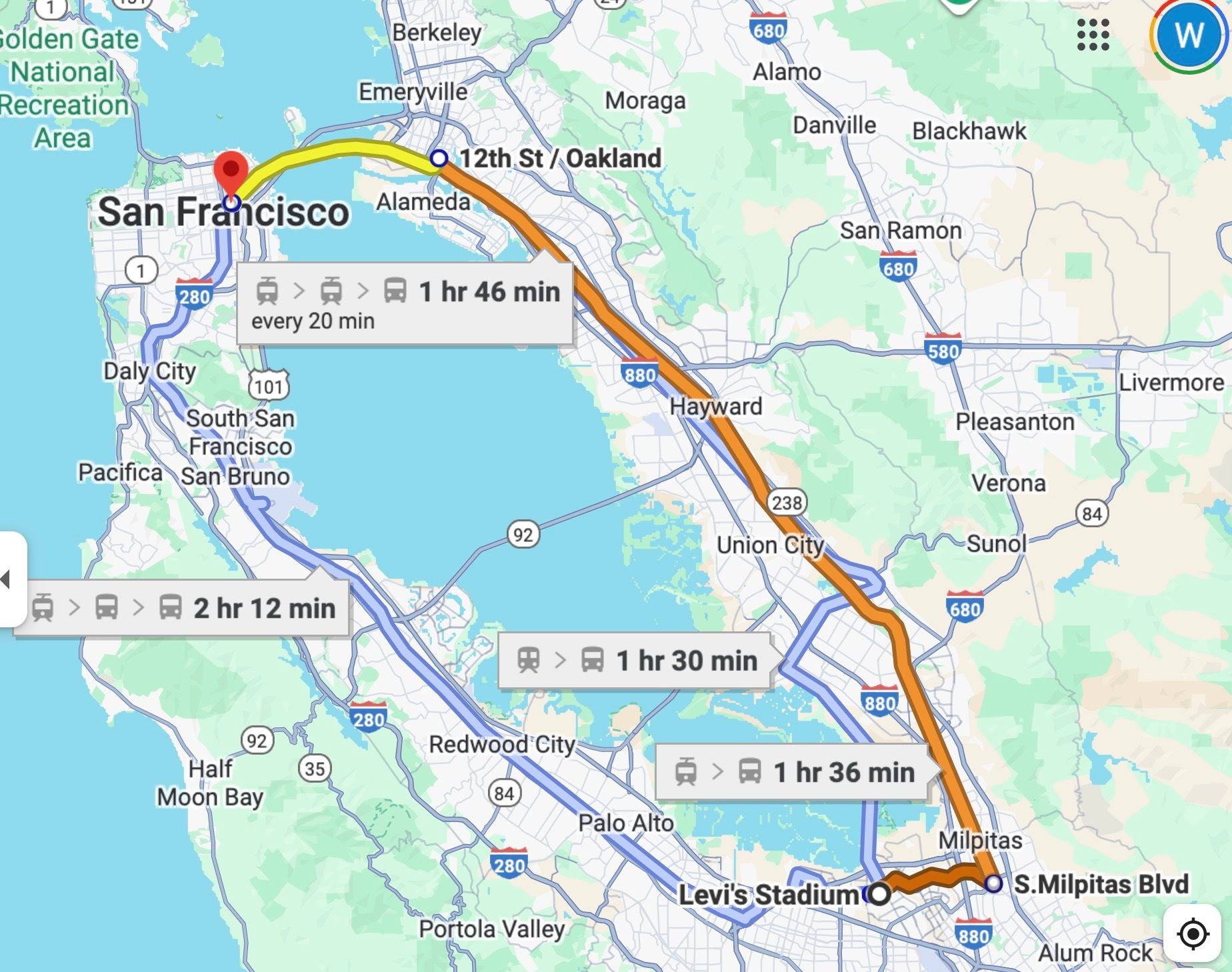 San Francisco Bay Area requires a two-stage, multi-hour journey just to get to Levi's Stadium in Santa Clara. To cover the 45+ miles, you must take Caltrain from San Francisco to Mountain View, then transfer to the VTA Light Rail—a minimum two-system, two-hour transit slog that requires separate fares and precise timing. You're paying the highest hotel prices in the country to be shuffled onto commuter trains for up to four hours of travel time round trip. The region is beautiful, sure, but the stadium location is a logistical disaster for any fan depending on public transit.